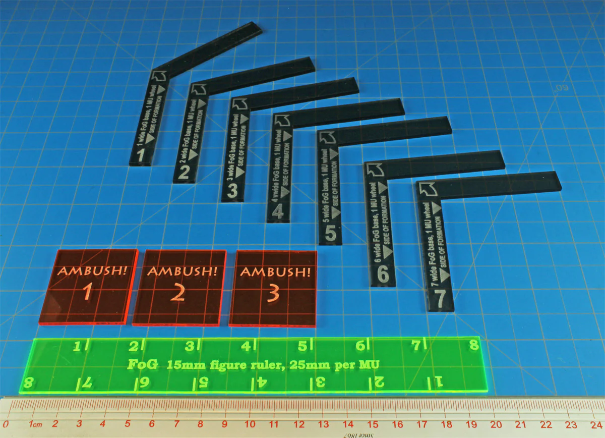 Bring your Field of Glory games together with an all-in-one acrylic measuring kit. This compact set covers core movement and effects—ruler, ambush templates, and wheel tools—so you can measure, wheel, and set ambushes with confidence. Compatible with Field of Glory.