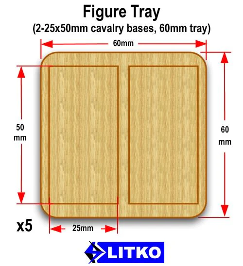 Move small cavalry elements with LITKO Formation Trays sized for 25x50mm rectangular bases. These precision laser-cut plywood trays arrive fully assembled, and keep two bases aligned for smooth movement and a minimal tabletop footprint. Each tray measures 60mm square with rounded corners. Figures and bases not included.