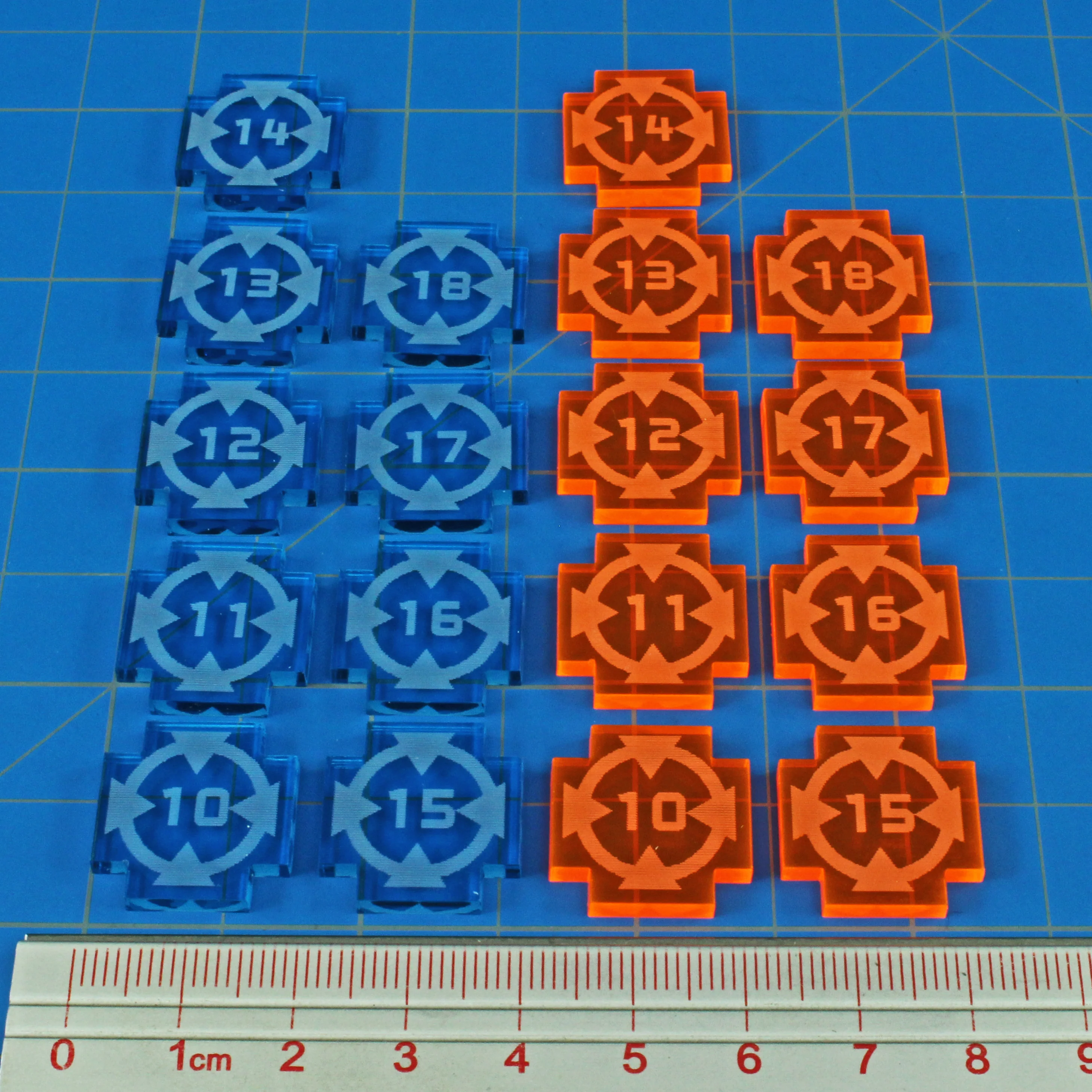 - (9) Fluorescent Blue 19mm Target Lock Tokens numbered 10–18