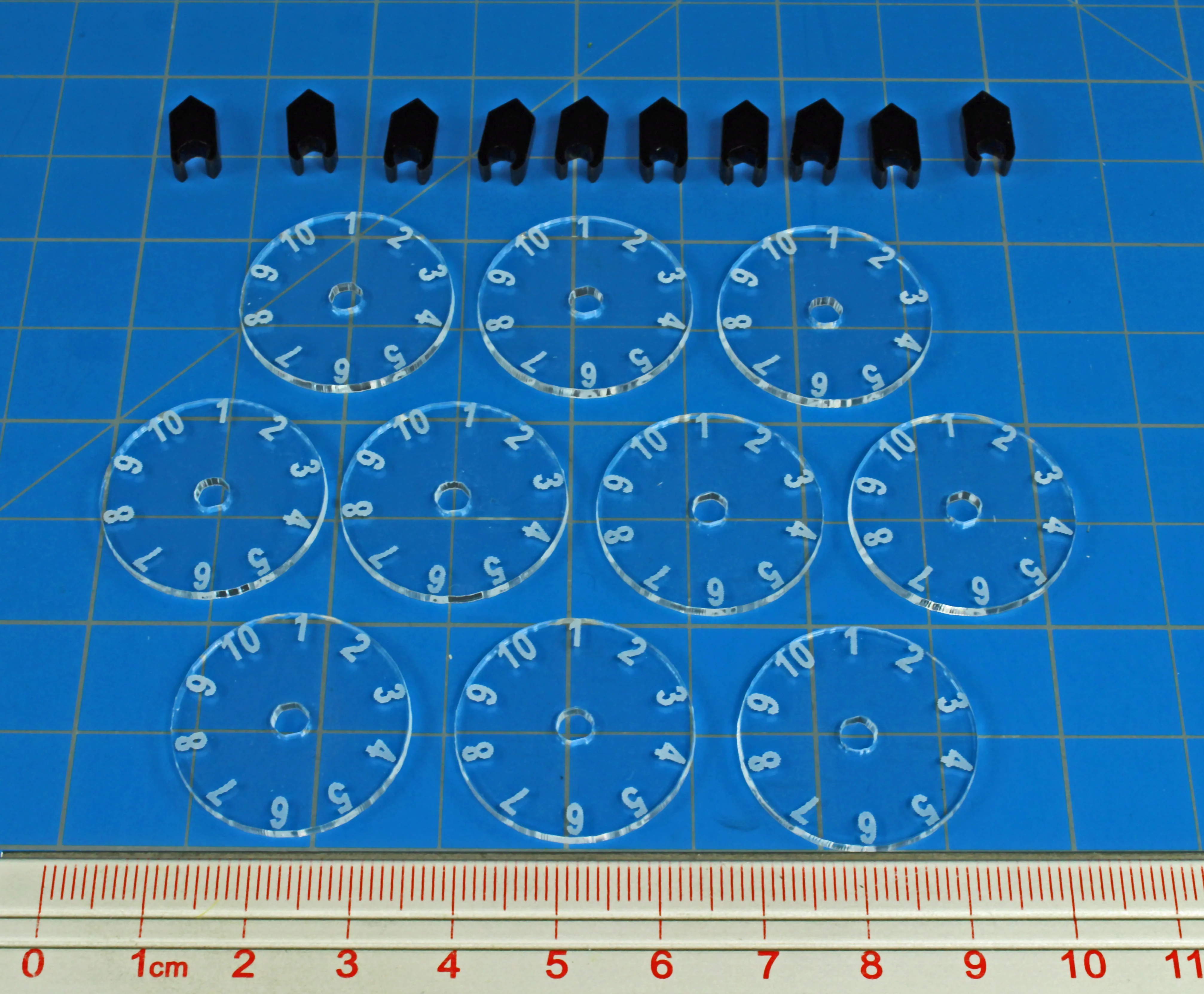 Track important values on your flight stands with these standard flight stand numbered dials and pointers. Each set includes a dial and matching pointer that work with LITKO standard 1/8 inch (3mm) flight pegs, giving you an easy way to record altitude, damage, speed, or other game stats right on the stand.