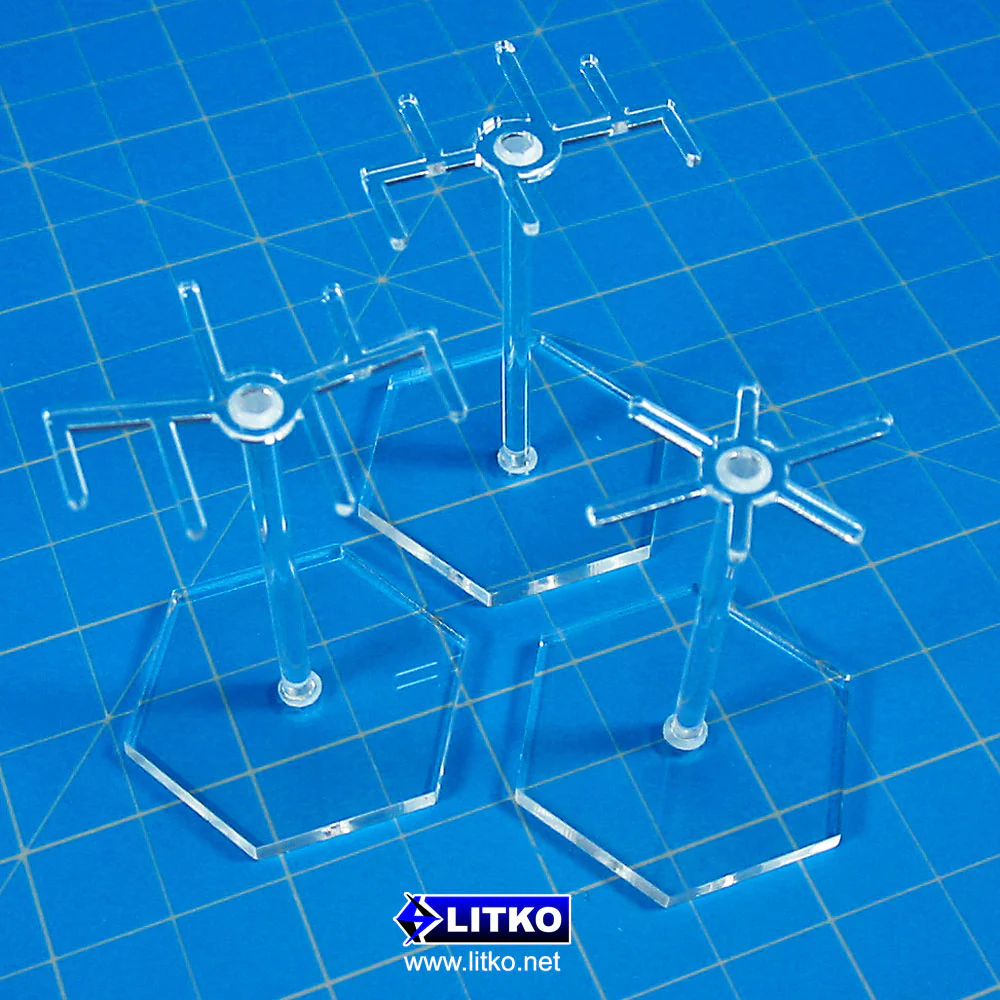 Mount multiple micro aircraft on a single stand with these 6-prong squadron peg toppers. Each topper clips onto LITKO standard 1/8-inch (3mm) flight pegs and provides six mounting points so that you can arrange micro planes and spacecraft in tight formations on the tabletop.