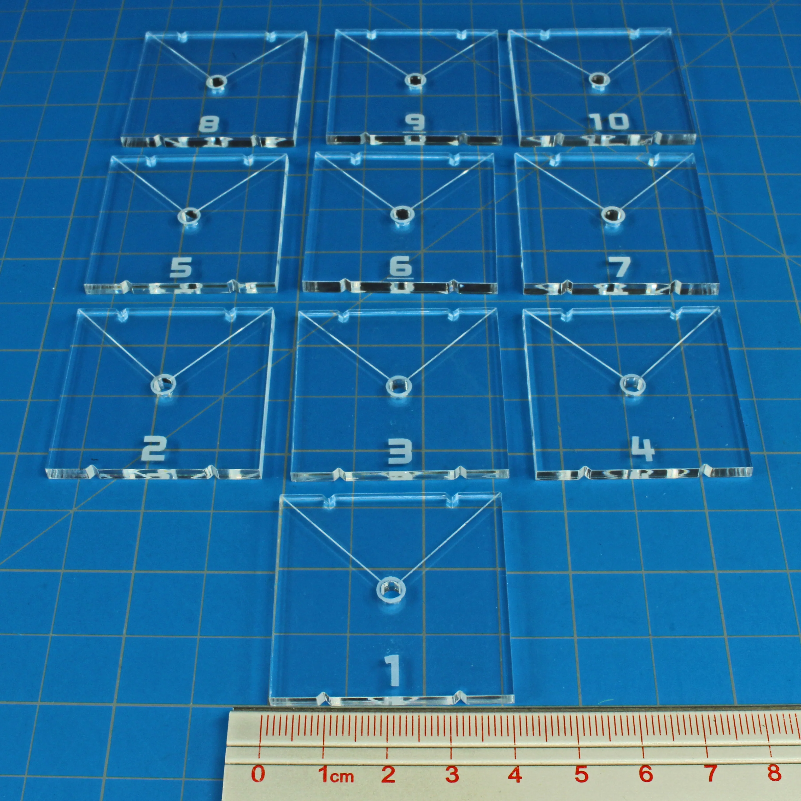 Upgrade your Star Wars: X-Wing squadrons with clear acrylic Space Fighter Flight Bases numbered 1–10. Each base features a 90° forward firing arc with front and rear notches, giving you precise positioning and targeting during your space dogfights.