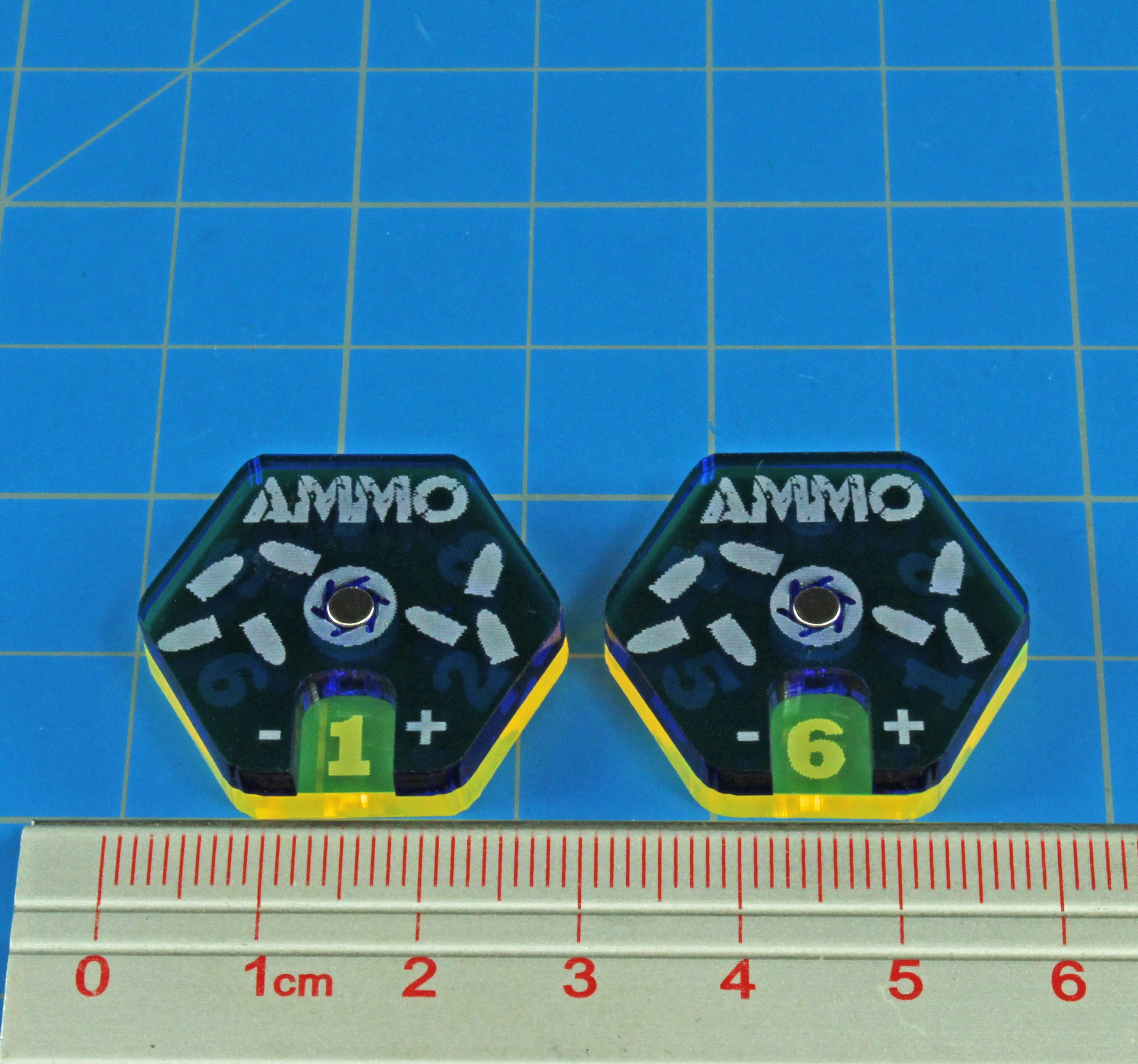Keep your crew’s firepower under control when the bullets start flying. These compact Ammo Dials log every burst and reload so you don’t lose count in the dust and debris. The translucent blue base carries laser-engraved numbers, while the fluorescent yellow top pops off the table for quick reads. Magnet-assembled for smooth, positive rotation through every firefight. Compatible with Gaslands.