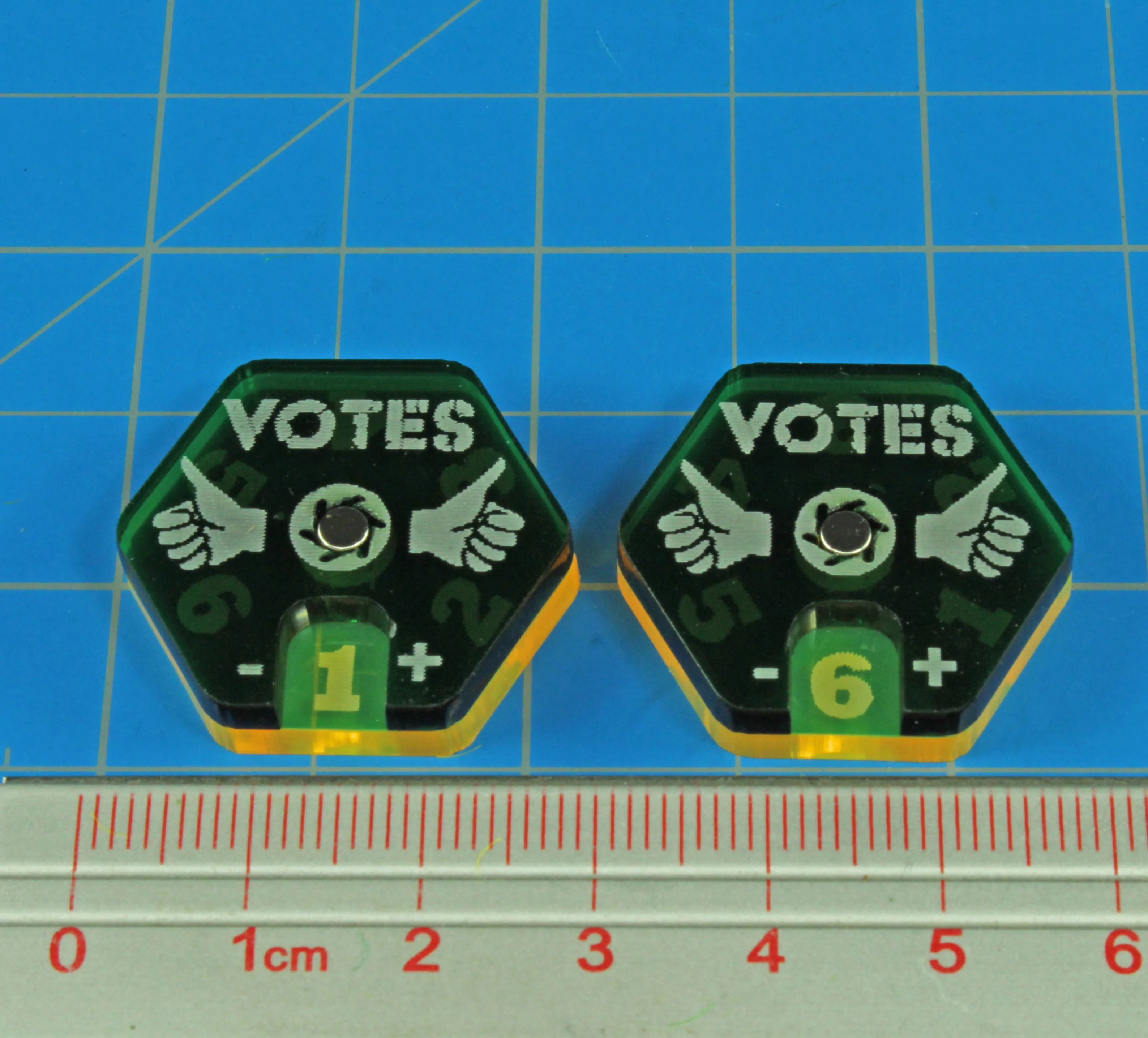 - (2) 25mm Translucent Green top + Fluorescent Yellow bottom Vote Dials