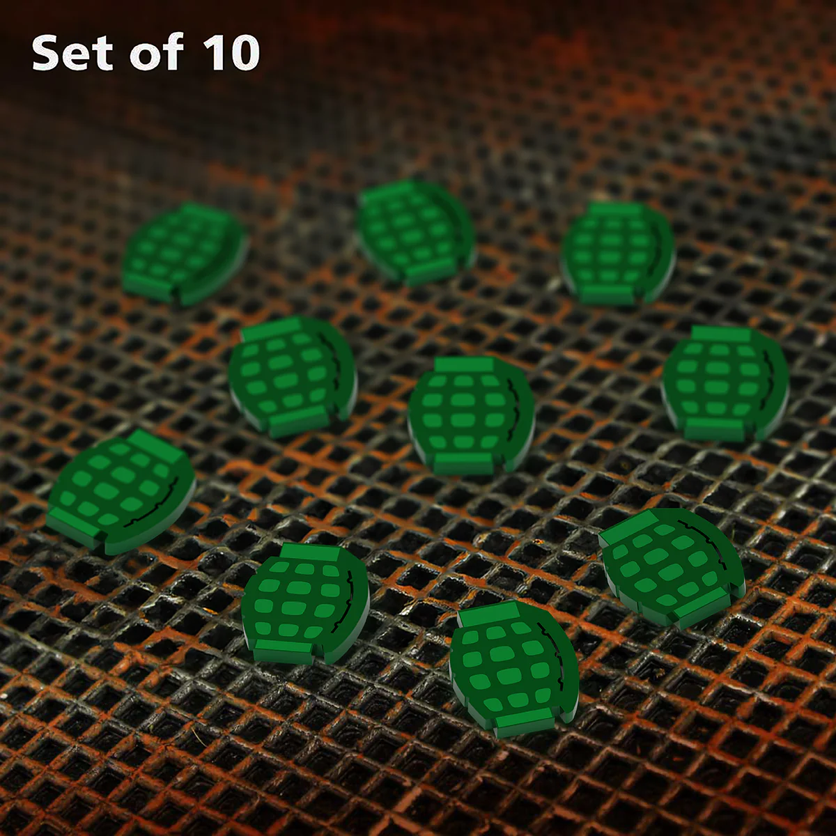 Add explosive flair to your tabletop with grenade-shaped markers made from durable, laser-cut acrylic. This 10-piece set in Green helps you track thrown grenades, blasts, and other area-of-effect results in your miniature games.