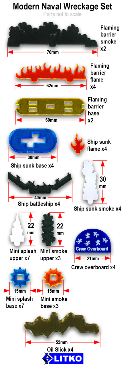 Create dramatic post-battle scenes in your modern naval wargames with the LITKO Modern Naval Wreckage Set. This mixed set of markers covers everything from crew overboard and spreading oil slicks to sunken ships, fires, smoke, and splashing shells, giving your sea battles a cinematic, story-rich look on the tabletop. Laser-cut acrylic pieces keep your wreck markers durable and consistent game after game.