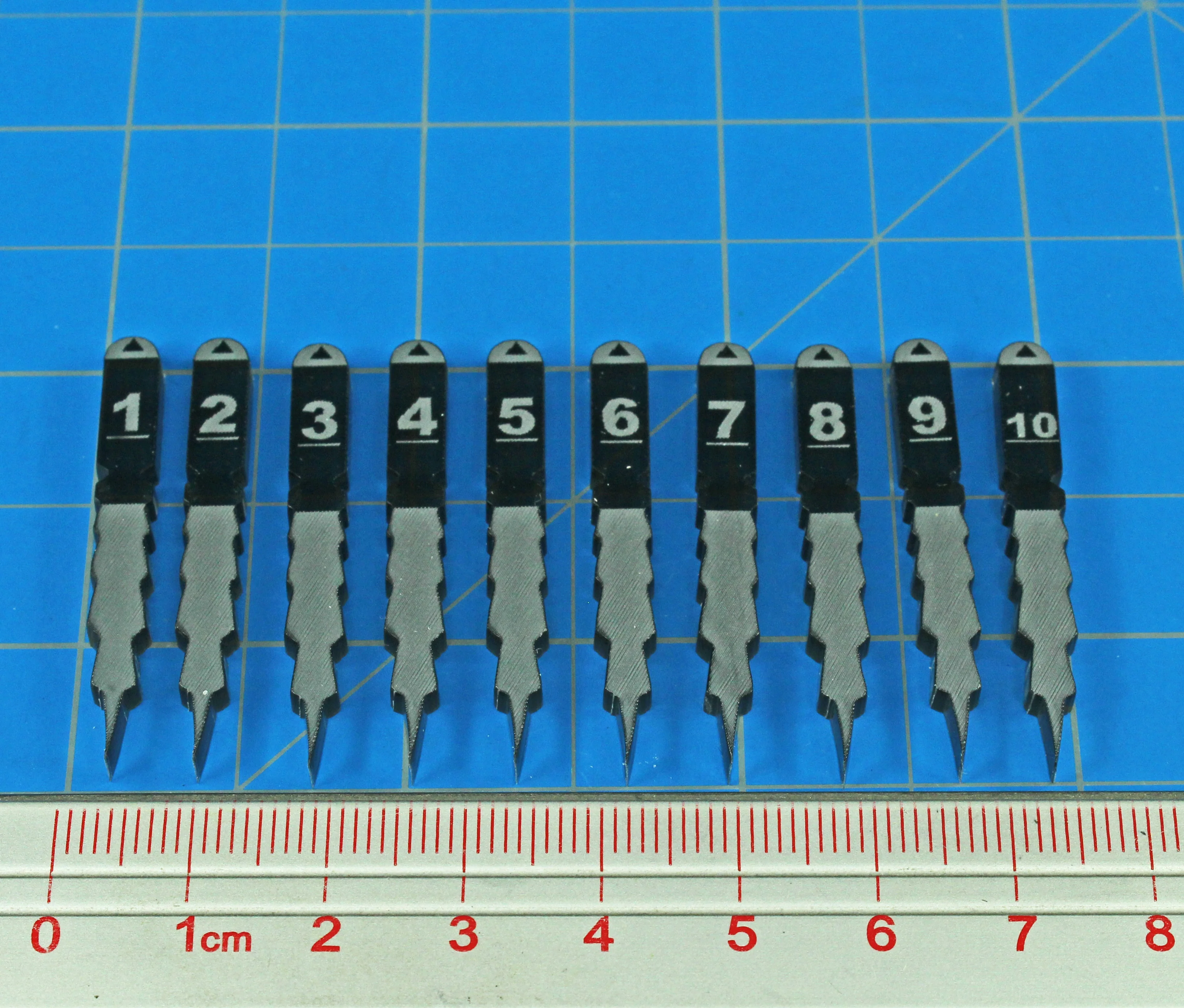 Track individual torpedoes and salvoes with numbered naval torpedo tokens. Each 40x4mm translucent grey marker is laser-cut from 3mm acrylic and engraved with a directional arrow, water turbulence, and numbers 1–10 for precise tracking on the tabletop.