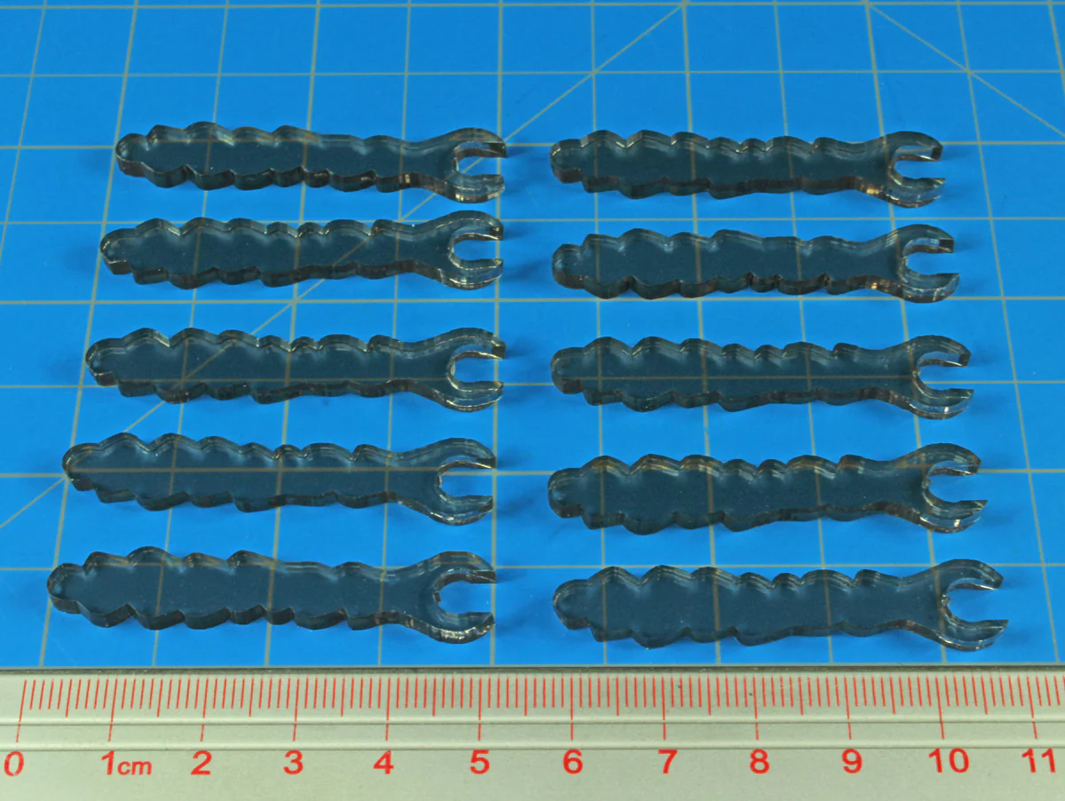 Show damaged or smoking aircraft at a glance with these smoke indicator peg clips. Made to work with stackable pegs from popular World War I aircraft miniatures games, they clip onto the peg stack so you can indicate smoke without surrounding the model with loose tokens.