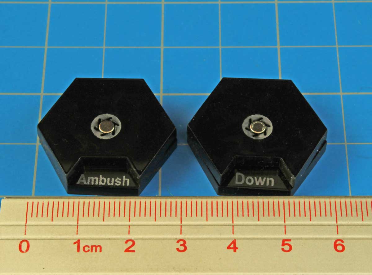 - (2) 25mm Hexagon Order Dials — Black; orders included: Advance, Ambush, Down, Fire, Rally, Run; magnet assembled