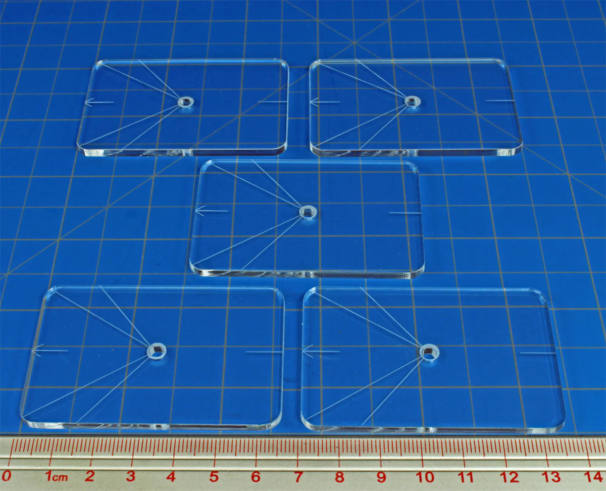 Upgrade your aircraft miniatures with this set of 44x67mm Dual Fire Arc flight bases. Each clear acrylic base includes 6mm rounded corners, engraved dual fire arc and direction markings, and a 3mm peg hole compatible with LITKO standard flight pegs (sold separately). These bases match the original game base size, corner radius, direction marks, and fire arc layout, making them ideal for replacements, alternate models, or expanding your current collection.