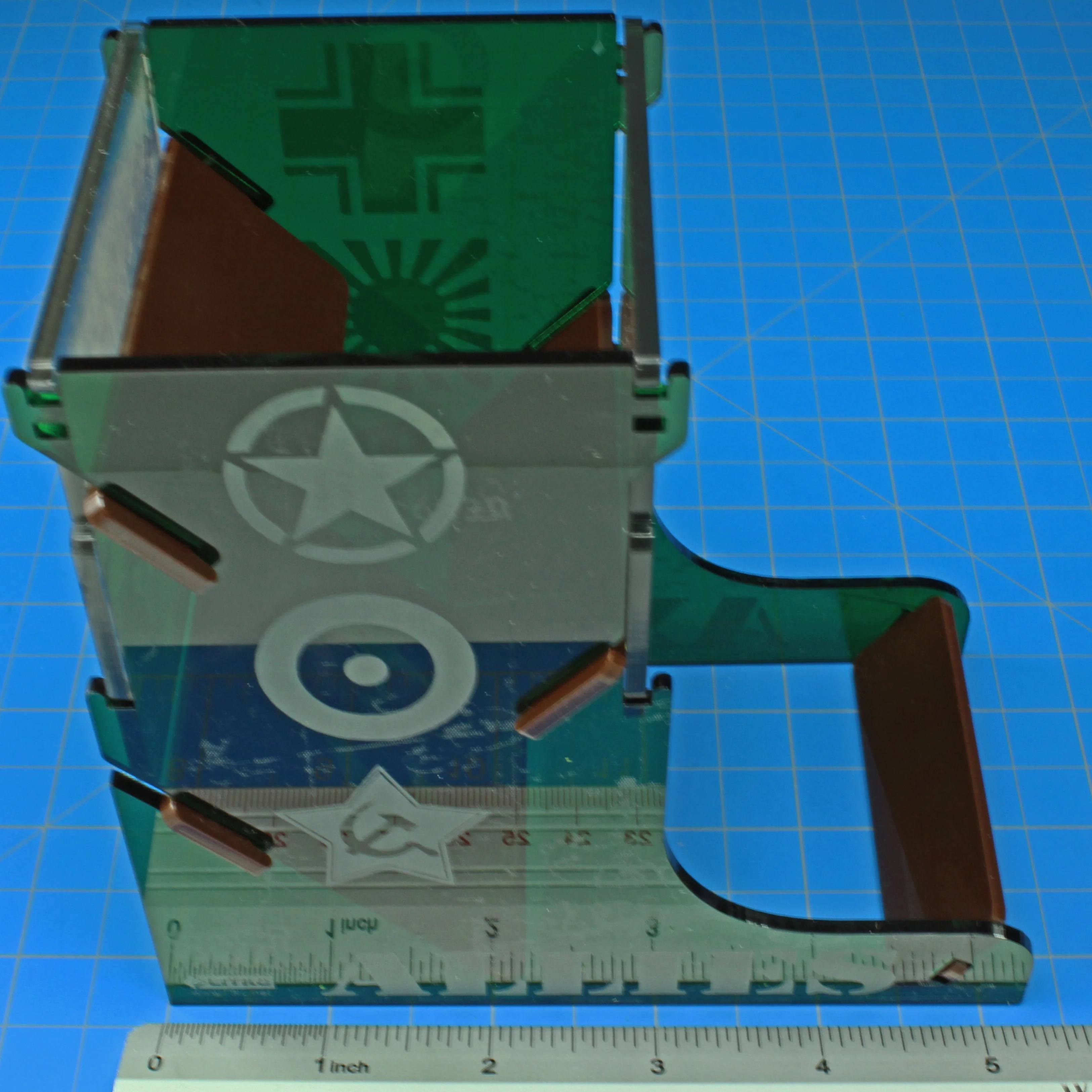 - WWII-themed acrylic dice tower that pairs well with World War II board games and miniature wargames.