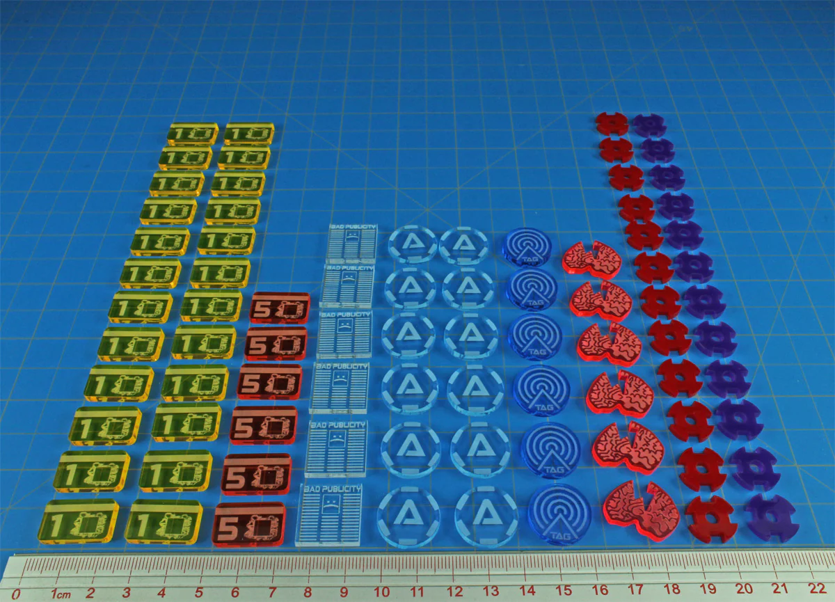 Upgrade your cyberpunk tabletop with a complete two-player token set. This 84-piece bundle features laser-engraved acrylic markers in color-coded denominations and effects, sized for clear, reliable play. Compatible with Android: Netrunner.