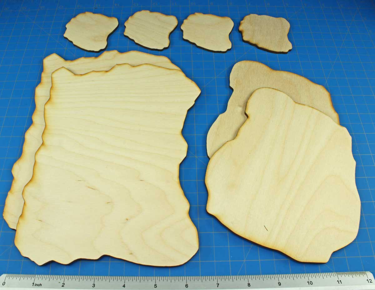- (8) 3mm plywood terrain tiles: (2) large, (2) medium, (4) small