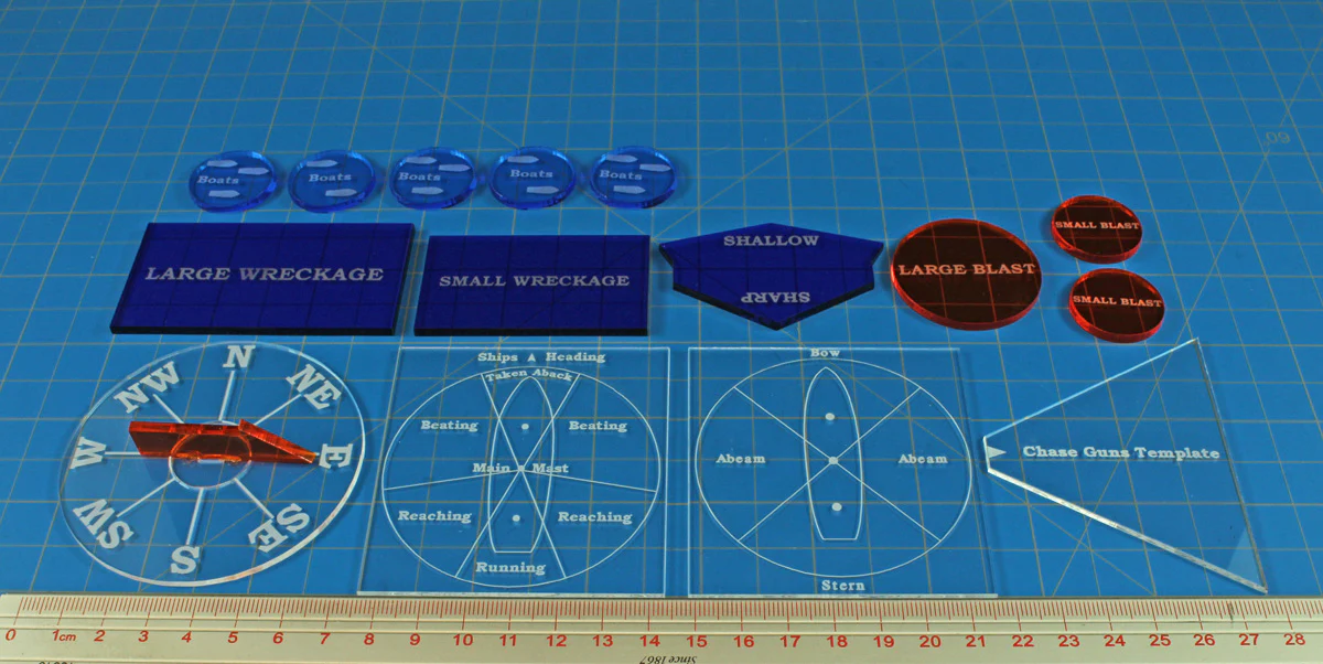 - (15) templates and tokens: heading template, fire-arc template, chase-guns template, large wreckage marker, small wreckage marker, turning tool, and a compass* with oversized direction markers.