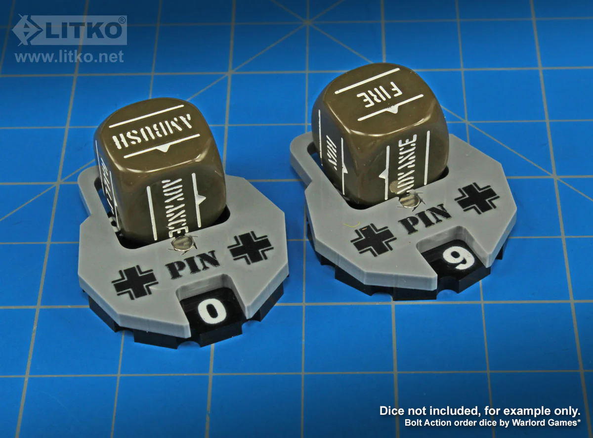Track unit morale efficiently with premium-printed German Army pin dials built for fast historical play. Each dial combines a numbered pin counter with an integrated dice dock, so orders and pin status travel with the unit.
